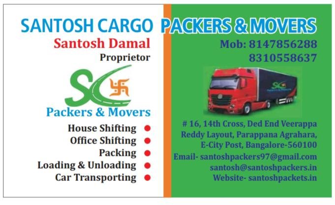 Santosh Cargo Packers and Movers is a proprietorship company managed by Mr. Santosh and located at 16, 14th Cross, Ded End Veerappa Reddy Layout, Parappana Agrahara, Post, Electronic City, Bengaluru. Mr. Santosh here is has worked his way with working with multiple Moving agencies namely Global Packers and Movers, Agarwal Super speed Packers and Movers and once a transporter he has gained experience and started M/s Santosh Cargo Packers and Movers Service to assist people searching for Domestic Shifting, Residential Household Relocation, Domestic Shifting, Cargo Moving, Bike Relocation, Car Transport and Door to door Transport service and allied service just to name few of regular service.