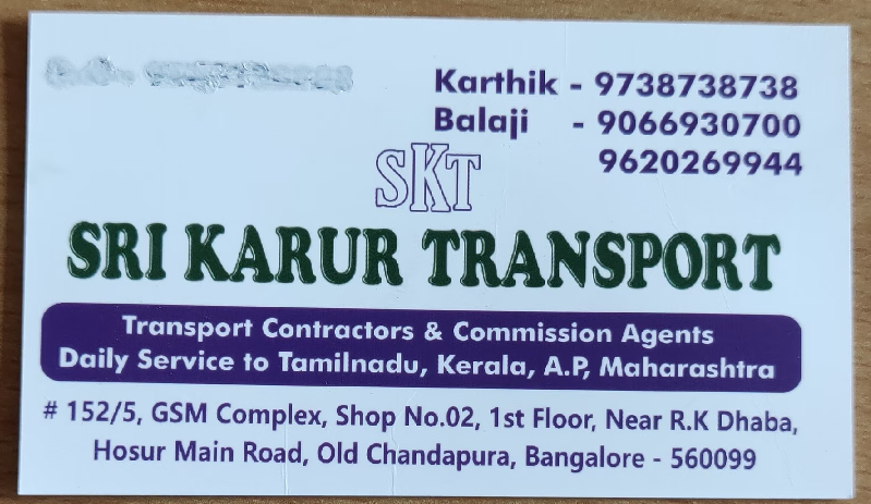 You can reach and locate Sri Karur Transport at No.152, SB Complex, GSM Complex, Bangalore Road, Near R K Dhaba, Old, Chandapura, Bengaluru, Bommasandra, Karnataka 560099.